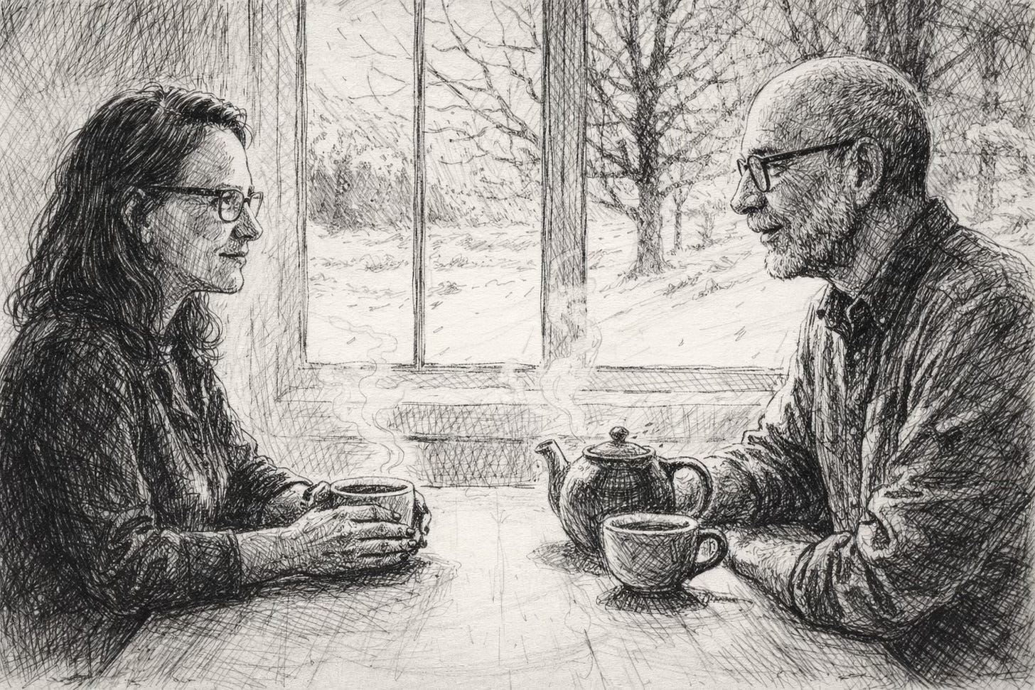 A thin thread of light moves across the table between us, the first suggestion of afternoon shifting, winter loosening its grip by a single, quiet degree.